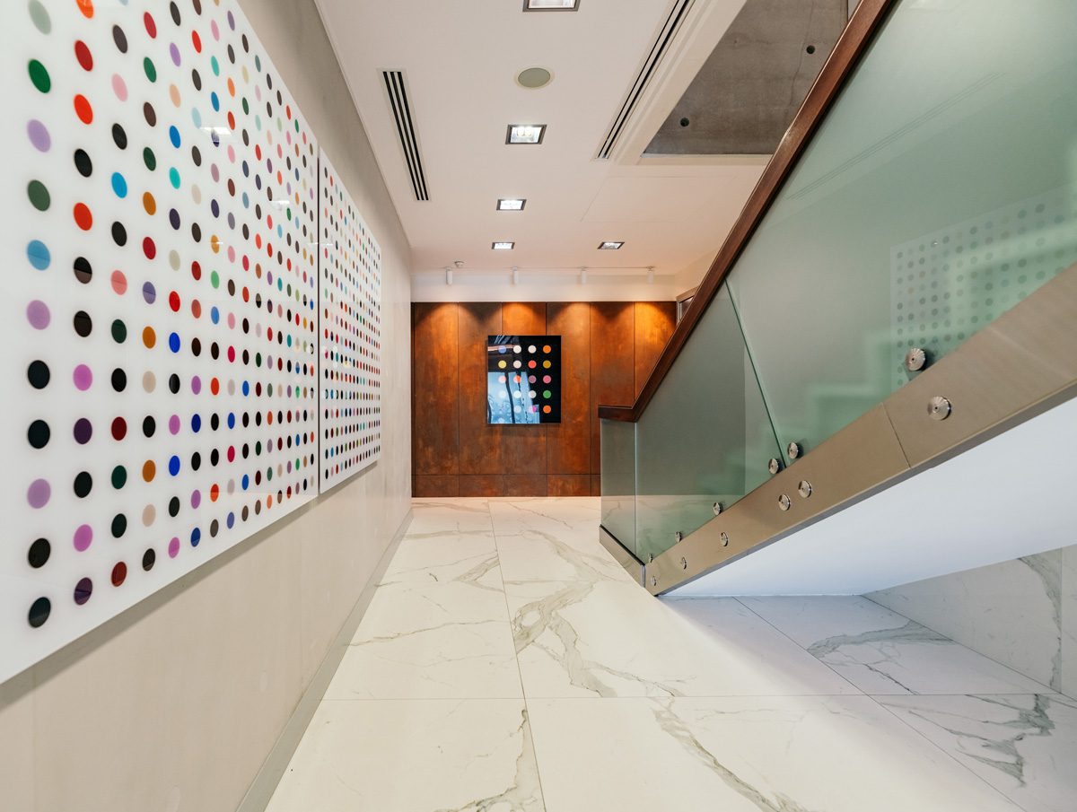 The building has glass façades which at the same time offer a nice view of the area and allow natural light to enter generously into the building.